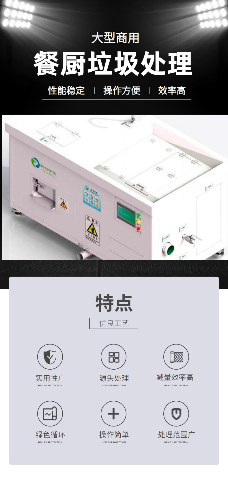 8、節(jié)能降耗:配備粉碎、濾水、脫水功能,高溫微生物發(fā)酵處理,從而大大降低能耗,比其他品牌同類產(chǎn)品節(jié)能50%以上。